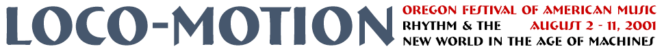 OFAM 2001, Loco-Motion, spins on two axles. First, there is the vast repertoire from just about every musical genre that is dedicated to or inspired by trains, cars, mechanical things and other vestiges of the Machine Age -- that rapidly-fading era when our devices of industry and convenience actually whirred, clicked, and chugged in beautiful, fascinating patterns. These patterns of sound fundamentally shaped the pulse and sense of our lives and it is natural that this influence would visit itself on our music both thematically and structurally.